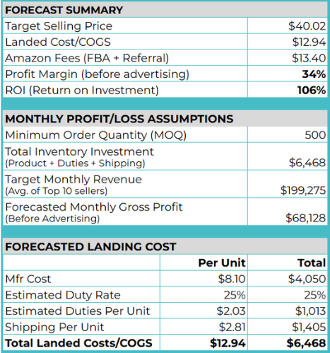 All projections are based on real marketplace data using tools we trust. While results can vary, we provide realistic estimates using top seller benchmarks, keyword volume, pricing trends, and supplier quotes.